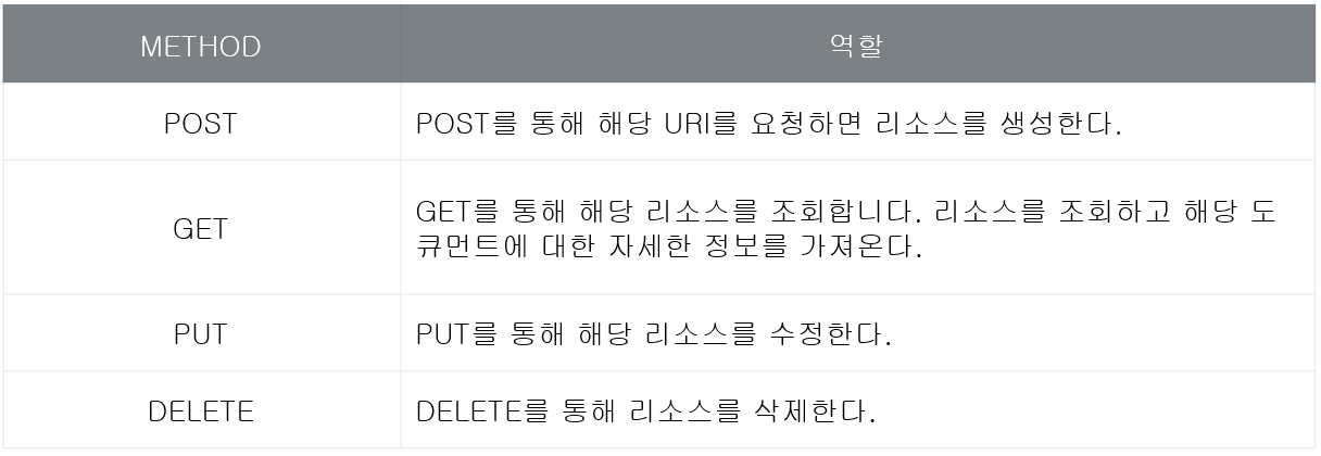 - 자원에 대한 행위는 HTTP Method(GET, POST, PUT, DELETE)로 표현한다.
