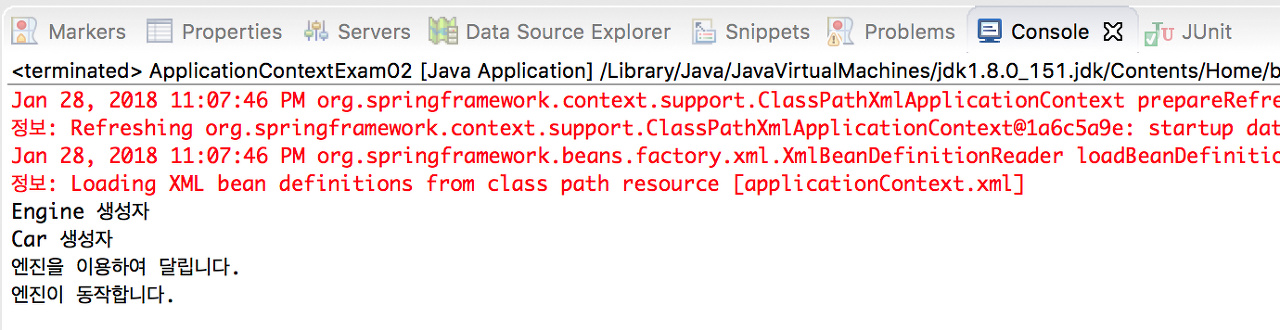 Engine e = new Engine(); Car c = new Car(); c.setEngine( e );그럼 이제 XML 파일 설정을 했으니 예제를 실행 해보자.