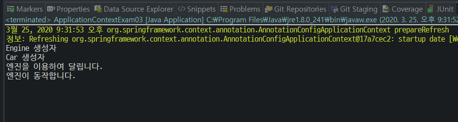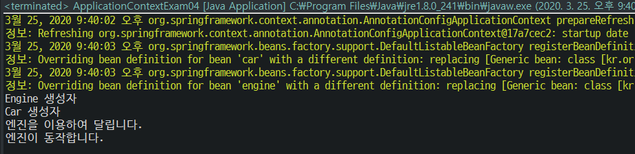 package kr.or.connect.diexam01; import org.springframework.context.annotation.*; @Configuration public class ApplicationConfig { @Bean public Car car(Engine e) { Car c = new Car(); c.setEngine(e); return c; } @Bean public Engine engine() { return new Engine(); } }ApplicationContextExam03.java