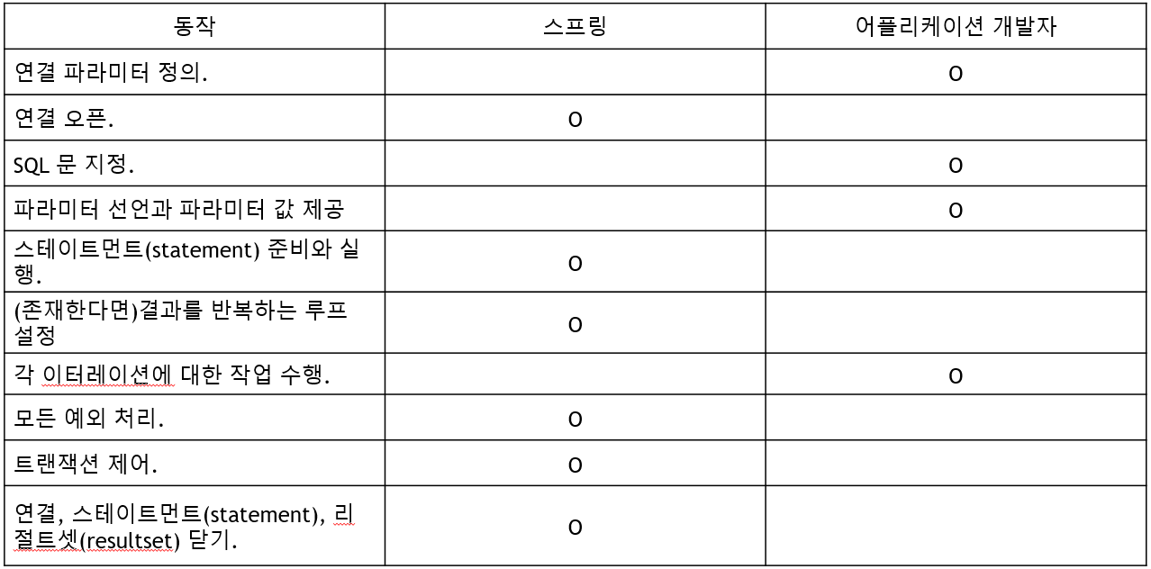 ◾ 반복적인 JDBC의 모든 저수준 세부사항을 Spring JDBC가 처리해준다.