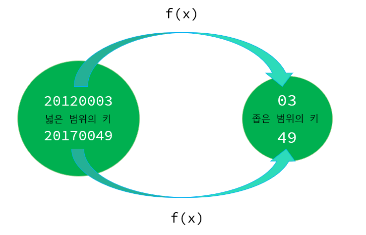 ◾ 해쉬 함수는 넓은 범위의 키를 좁은 범위의 키로 변경하는 역할을 한다.