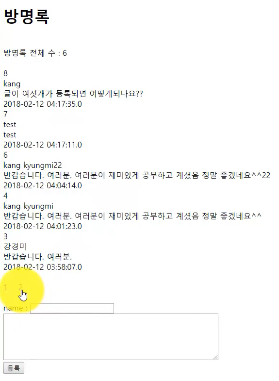 더보기<%@ page language="java" contentType="text/html; charset=UTF-8" pageEncoding="UTF-8"%> <%@ taglib prefix="c" uri="http://java.sun.com/jsp/jstl/core"%> <!DOCTYPE html PUBLIC "-//W3C//DTD HTML 4.01 Transitional//EN" "http://www.w3.org/TR/html4/loose.dtd"> <html> <head> <meta http-equiv="Content-Type" content="text/html; charset=UTF-8"> <title>방명록 목록</title> </head> <body> <h1>방명록</h1> <br> 방명록 전체 수 : ${count } <br> <br> <c:forEach items="${list}" var="guestbook"> ${guestbook.id }<br> ${guestbook.name }<br> ${guestbook.content }<br> ${guestbook.regdate }<br> </c:forEach> <br> <c:forEach items="${pageStartList}" var="pageIndex" varStatus="status"> <a href="list?start=${pageIndex}">${status.index +1 }</a> </c:forEach> <br> <br> <form method="post" action="write"> name : <input type="text" name="name"><br> <textarea name="content" cols="60" rows="6"></textarea> <br> <input type="submit" value="등록"> </form> </body> </html>👀 결과