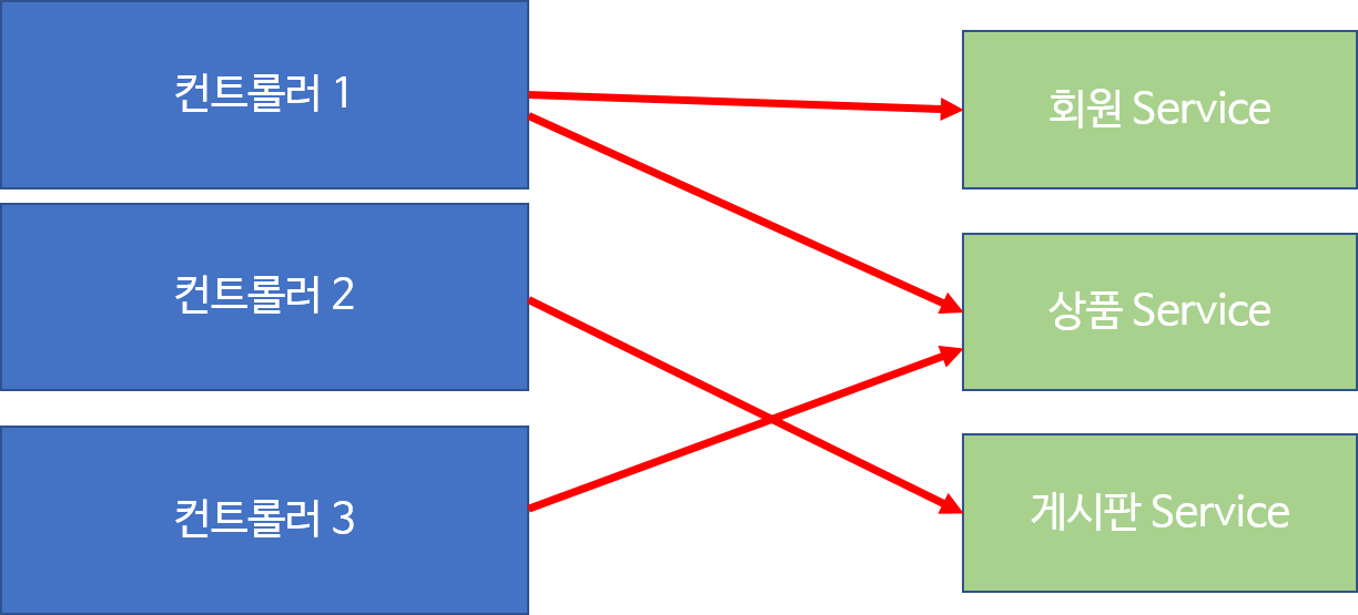 컨트롤러와 서비스 ◾ 위 그림을 보면 컨트롤러 1,3은 상품 Service 객체를 각각 구현하는 것이 아니라, 가져다 쓴다.