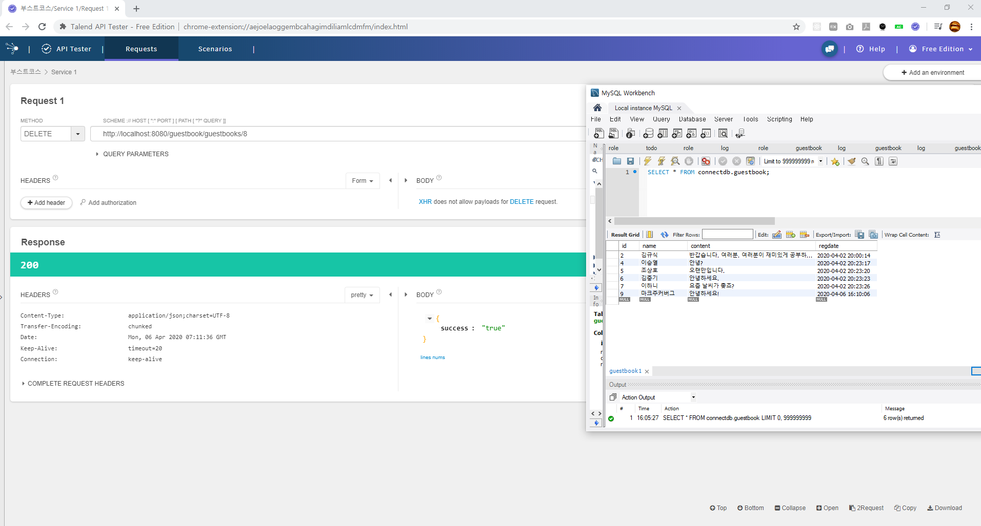 더보기package kr.or.connect.guestbook.controller; import java.util.ArrayList; import java.util.Collections; import java.util.HashMap; import java.util.List; import java.util.Map; import javax.servlet.http.HttpServletRequest; import org.springframework.beans.factory.annotation.Autowired; import org.springframework.web.bind.annotation.DeleteMapping; import org.springframework.web.bind.annotation.GetMapping; import org.springframework.web.bind.annotation.PathVariable; import org.springframework.web.bind.annotation.PostMapping; import org.springframework.web.bind.annotation.RequestBody; import org.springframework.web.bind.annotation.RequestMapping; import org.springframework.web.bind.annotation.RequestParam; import org.springframework.web.bind.annotation.RestController; import kr.or.connect.guestbook.dto.Guestbook; import kr.or.connect.guestbook.service.GuestbookService; //Rest 컨트롤러이다. @RestController @RequestMapping(path="/guestbooks") // 이렇게 해주면 잎에 "/guestbooks"을 붙여야함. public class GuestbookApiController { // 서비스 객체 주입 @Autowired GuestbookService guestbookService; // guest book 리스트 반환 // 반환형이 Map 객체이다. 디스패처 서블릿은 json 메세지 컨버터를 내부적으로 사용해서 List Map객체를 json으로 변환해서 전송한다. @GetMapping public Map<String, Object> list(@RequestParam(name="start", required=false, defaultValue="0") int start) { List<Guestbook> list = guestbookService.getGuestbooks(start); int count = guestbookService.getCount(); int pageCount = count / GuestbookService.LIMIT; if(count % GuestbookService.LIMIT > 0) pageCount++; List<Integer> pageStartList = new ArrayList<>(); for(int i = 0; i < pageCount; i++) { pageStartList.add(i * GuestbookService.LIMIT); } Map<String, Object> map = new HashMap<>(); // json으로 만들 데이터를 map 만들어준다. map.put("list", list); map.put("count", count); map.put("pageStartList", pageStartList); return map; } // 여기도 Guestbook 객체로 반환되는데, 이를 디스패처 서블릿이 json 메세지 컨버터를 내부적으로 사용해서 json으로 변환해서 전송한다. // geuest book 작성 @PostMapping public Guestbook write(@RequestBody Guestbook guestbook, HttpServletRequest request) { String clientIp = request.getRemoteAddr(); // id가 입력된 guestbook이 반환된다. Guestbook resultGuestbook = guestbookService.addGuestbook(guestbook, clientIp); return resultGuestbook; } //guest book 삭제 @DeleteMapping("/{id}") //결과 정보를 담은 map 객체로 반환되는데,이를 디스패처 서블릿이 json 메세지 컨버터를 내부적으로 사용해서 json으로 변환해서 전송한다. public Map<String, String> delete(@PathVariable(name="id") Long id, HttpServletRequest request) { String clientIp = request.getRemoteAddr(); int deleteCount = guestbookService.deleteGuestbook(id, clientIp); return Collections.singletonMap("success", deleteCount > 0 ? "true" : "false"); } }👀 GET 결과