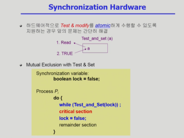Synchronization Hardware ◾️ 데이터를 메모리에서 읽고, 쓰는 작업을 하드웨어적으로 Atomic하게(동시에) 실행할 수 있다.