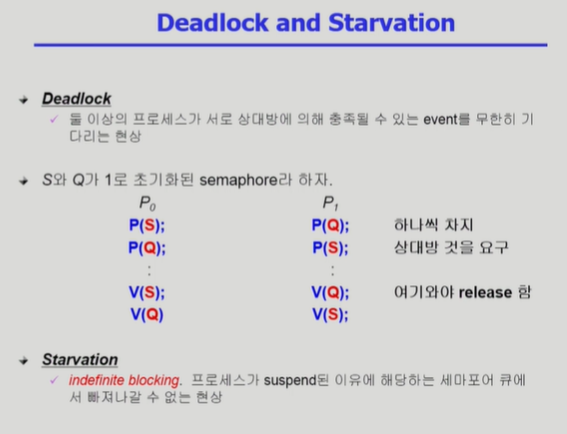 DeadLock and Starvation ◾️ 0번, 1번 프로세스는 S와 Q 두 자원이 모두 필요하다. 하지만 각각 S, Q를 하나씩 가지고 있는 상황이다. 이런 경우 무한 대기가 발생하는데, 이를 Dead Lock이라고 한다. (Starvation이라고 말할 수도 있겠다.)