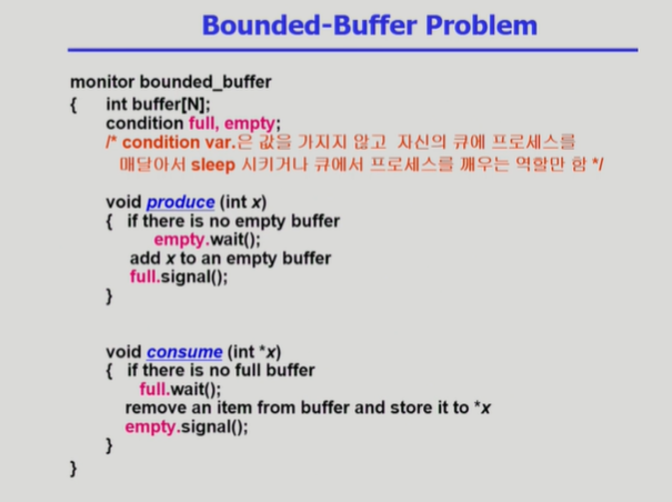 Bounded-Buffer Problem Monitor Solution ◾️ 생산자와 소비자는 모니터 내부에 프로시저로 정의되어 있다.