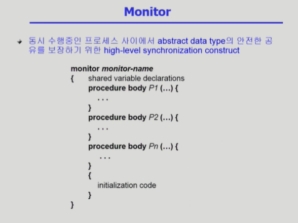 Monitor (2) ◾️ 모니터는 프로그래밍 언어차원에서 동기화문제를 해결하는 하이레벨 동기화 컨스트럭터다.