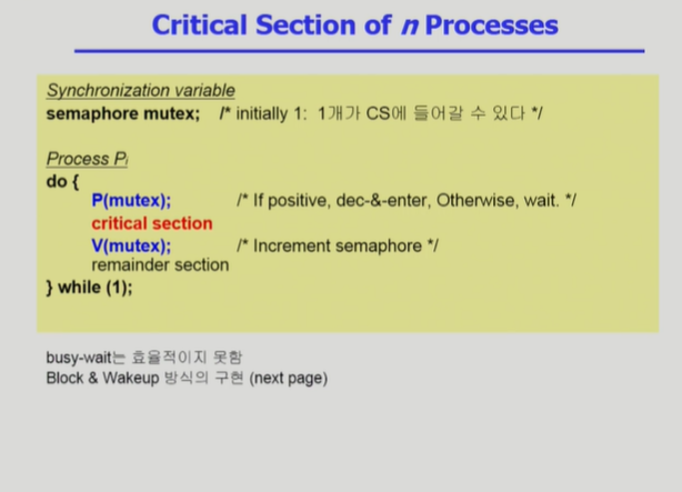 Busy waiting 방식의 Semaphore (Mutex) (2) ◾️ CS 진입 전에는 P연산으로 자원을 획득하고, CS 수행후에는 V연산으로 자원을 반납한다.