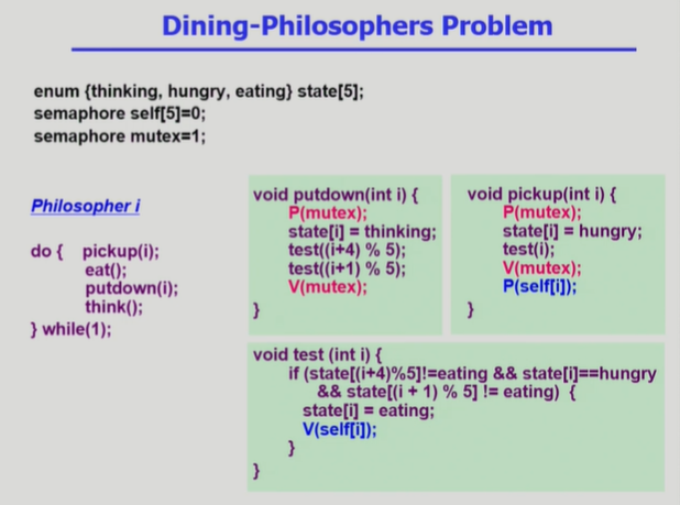 ◾️ putdown 함수 : 철학자가 식사를 마친후 호출하는 함수. 자신의 왼쪽, 오른쪽 철학자에 대해 test 함수를 실행시켜서, 왼쪽 또는 오른쪽 철학자가 양쪽 젓가락을 잡을 수 있는 상태라면, V(self[i]) 연산을 통해 pickup에서 대기하던 철학자를 깨운다.