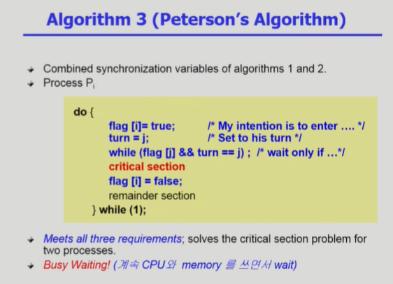 ◾️ 위 알고리즘의 문제점 : Busy Waiting(Spin Lock)방식이다. Busy Waiting이란 while문 반복 대기를 말한다. 이는 지속적으로 cpu와 memory 사용을 유발해서 비효율적인 방법이다.