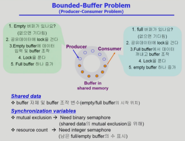 Producer-Consumer Problem (1) ◾️ 공유 버퍼가 있다. 생산자는 빈 버퍼에 데이터를 하나 만들어서 넣고, 소비자는 데이터가 들어있는 버퍼에서 데이터를 하나 꺼내는 행위를 한다. (주황색 동그라미가 데이터)