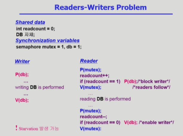 ◾️ Writer는 DB에 데이터를 쓰기전에 p(db) 연산으로 Lock을 걸고, 데이터를 다 쓴후 v(db) 연산으로 Lock을 푼다.