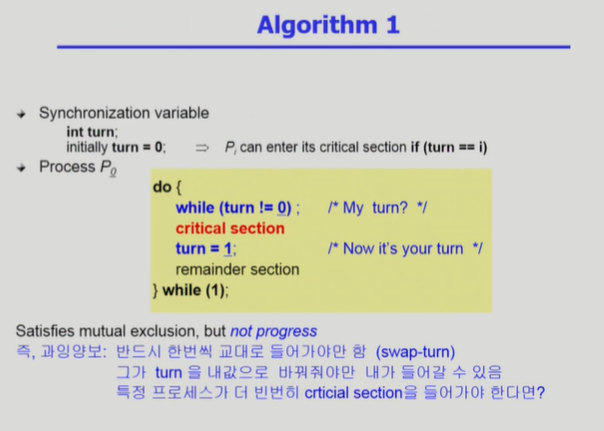 ◾️ 위 알고리즘의 문제점 : Progress(진행) 조건을 만족하지 못한다. 프로세스 0번이 CS에 진입하기 위해서는 1번 프로세스가 CS에 진입해야한다. (1번 프로세스가 turn을 0으로 바꿔줄 수 있다.) 0번 프로세스가 CS에 여러번 진입하고 싶은데, 1번 프로세스는 단 한 번 CS에 진입한다면, 0번 프로세스는 CS에 여러번 진입할 수 없다.