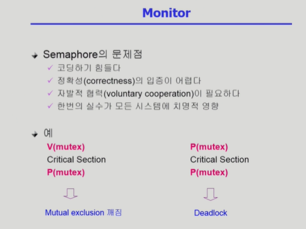Monitor (1) ◾️ 프로그래머의 실수로 P, V 연산의 순서가 바뀌면, 동기화가 되지 않는다.