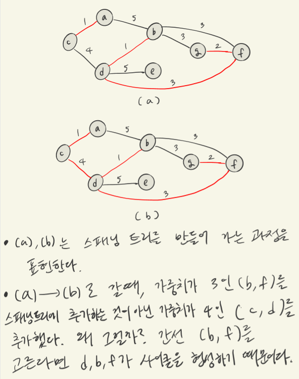 - 간선 목록을 순회하면서, 이들을 스패닝 트리에 추가한다.