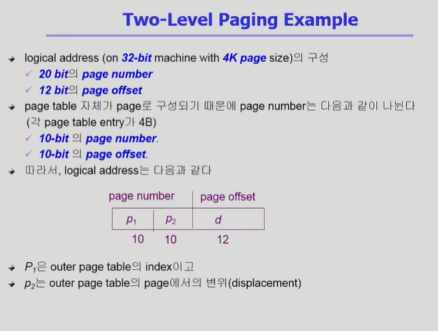 ◾️ 2단계 이상으로 Page Table을 사용할 수 있다. 하지만 한 번의 주소 변환을 위해 여러 단계를 거쳐야하는 단점이 있다.