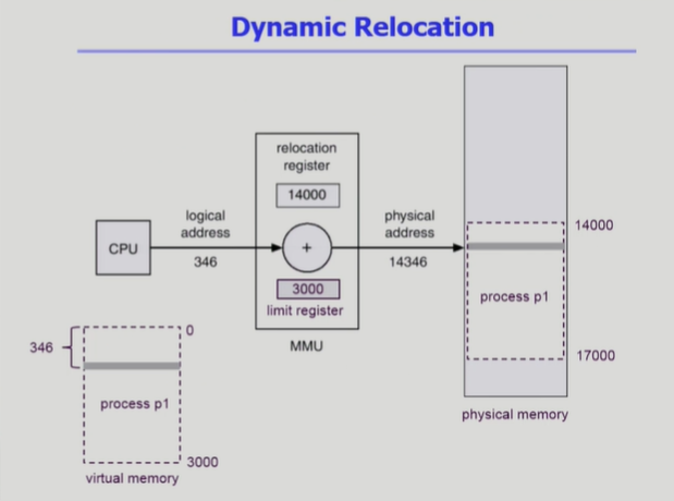 ◾️ relocation(base) register : 물리적 메모리에 적재되어 있는 프로세스 P1의 시작 위치를 가지고 있다.