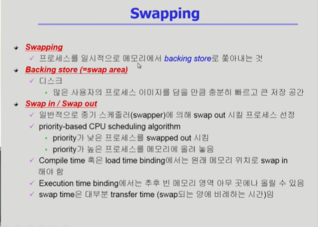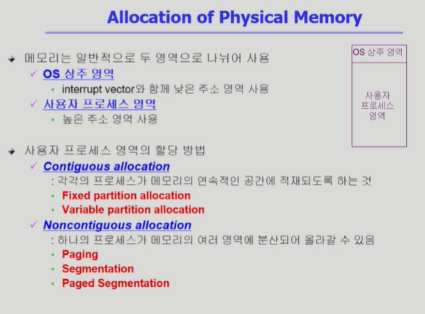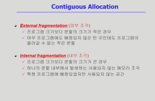 ◾️ Noncontiguous allocation(불연속 할당) : 프로그램을 구성하는 주소 공간을 잘게 조각내서 물리적 메모리리 여러 위치에 분산해서 적재하는 방법. 현대 컴퓨터 시스템에서 사용한다.