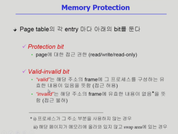 ◾️ 프로세스는 자기 자신의 Page Table만 접근할 수 있다. 즉, Protection bit는 다른 프로세스의 Page 접근 권한을 막는 용도가 아니다. Protection bit은 연산에 대한 권한을 막는 것이다. (예를들어 code 영역이 들어있는 Page를 읽으면 read-only로 세팅하고, data Page를 읽으면 read/write를 허용하는 세팅을 한다. code 영역이 들어있는 Page에 대해 write를 허용하면 안되지 않겠는가?)
