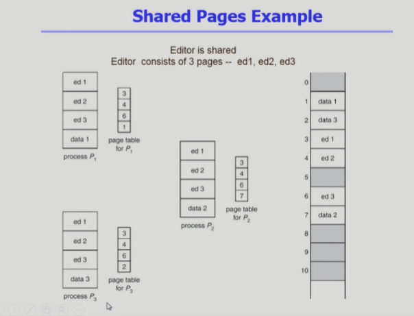 ◾️ P1, P2, P3은 공통적으로 ed1, ed2, ed3 Page를 사용한다. 프로세스당 ed1, ed2, ed3을 각각 올릴 필요없이 한 세트만 메모리에 적재하고 Page Shared를 하면 효율적이다.