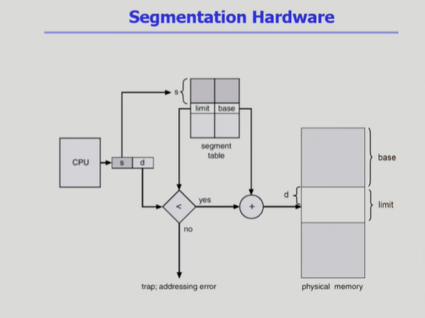 ◾️ 논리적 주소의 d를 limit와 비교한다. 만약 d가 limit 보다 크다면, 해당 Segment 크기를 넘어서는 offset(하나의 세그먼트 내부에서 떨어진 정도)이다. 따라서 trap이 걸린다.