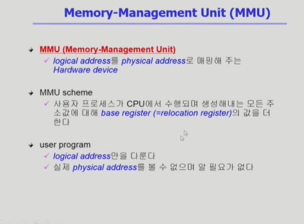 주소 변환은 MMU 하드웨어를 통해 이루어진다. MMU는 relocation(base) register와 limit register 두 개로 구성된다.