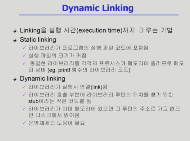 ◾️ Dynamic Linking : 실행 파일안에 라이브러리 코드가 포함 되지 않음. 대신 라이브러리의 위치를 찾을 수 있는 stub이라는 포인터를 포함하는데, 라이브러리를 실행할때 stub을 통해 라이브러리를 호출하여 물리적 메모리에 적재하여 사용한다.