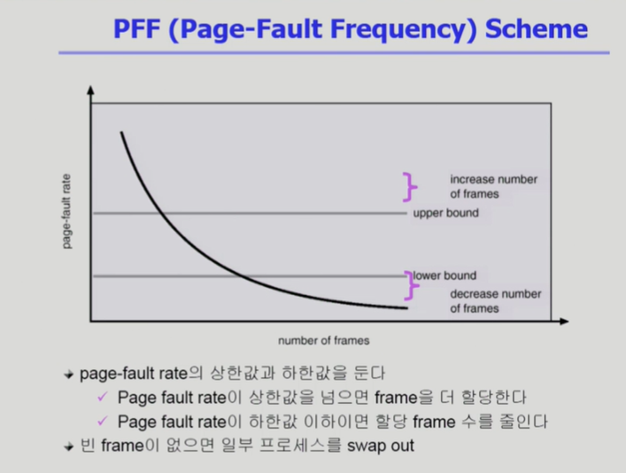 ◾️ PFF는 프로세스에 대한 Page Fault rate를 통해 Page Frame 할당수를 조절하는 알고리즘이다.