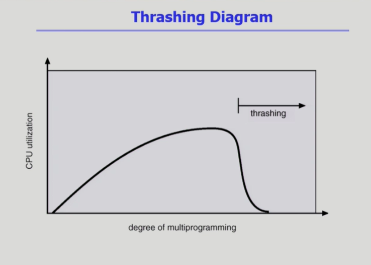 ◾️ 아주 많은 프로그램이 메모리에 올라간다면, 프로그램당 할당되는 메모리 공간 (Page 할당수)이 적고 각 프로세스는 Page Fault를 많이 발생시킨다. 즉 I/O 대기가 많이 발생하여 cpu는 idle 상태를 자주격는다. OS는 이런 현상을 cpu가 노논다고 판단하여 프로그램을 더 running 시키려고 메모리에 올린다. 상황을 악화되고 Thrashing을 겪는다.