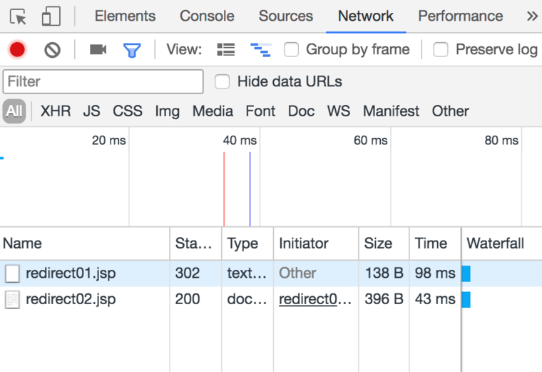 - 아래 보면 redirect01.jsp 의 응답 코드는 302인 것을 관찰할 수 있다.